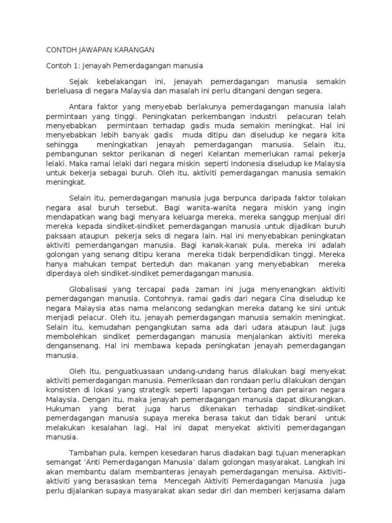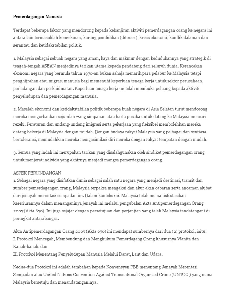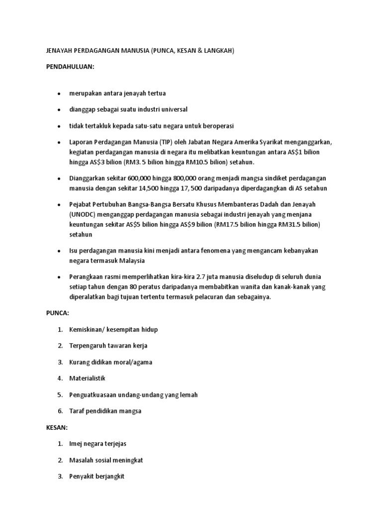 Faktor-faktor berlakunya jenayah pemerdagangan manusia dan langkah-langkah yang harus diambil untuk menanganinya Era globalisasi yang sarat dengan pelbagai cabaran zahir dan maya ini terbit satu masalah yang kian membimbangkan masyarakat dunia iaitu jenayah pemerdagangan manusia. This shows that the world is facing human trafficking conflict and requires concern from all parties in the effort to. Kenapa mereka menjadi mangsa utama berbanding golongan lelaki.